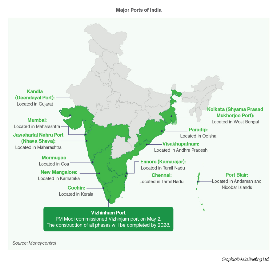 Vizhinjam International Seaport Ltd. (VISL), a Government of Kerala special purpose entity, is developing India’s first deep-water, all-weather container transshipment port at Vizhinjam under a PPP model, with operations managed by Adani Vizhinjam Port Pvt. Ltd. Located 10 nautical miles from the main east–west shipping corridor, the port offers an initial capacity of about 1 million TEUs, scalable to over 6.2 million TEUs, strengthening India’s transshipment competitiveness.