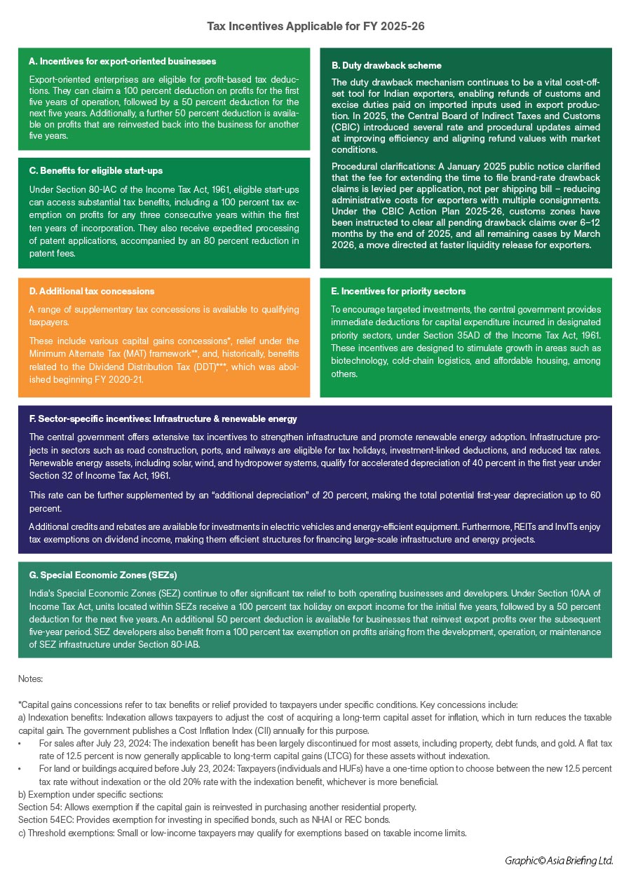 India offers tax relief at both the central and state level. Additional incentives are available to investors in specific sectors, while India’s special economic zones (SEZs) offer their own comprehensive tax relief. However, not all tax benefits offered are mutually inclusive.