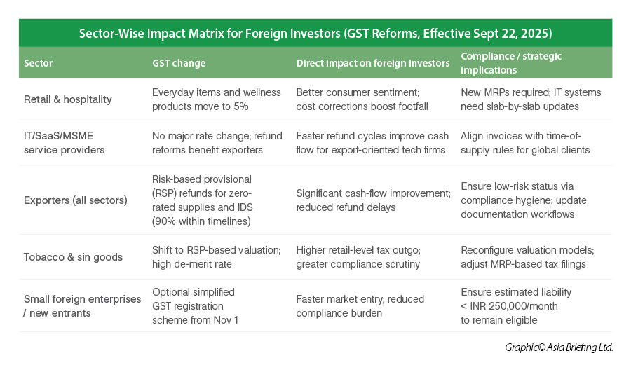 | Hospitality & restaurants | 12% / 18% | 5% (merit rate) | Cheaper dining and travel-related services stimulate consumption in hospitality. |